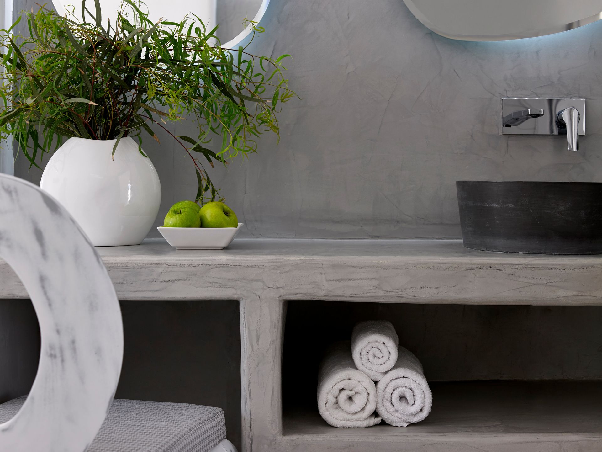 Situated on all levels of the hotel comprising of one open plan cement mortar shower bathroom, 2 twin beds, or a king-size bed.